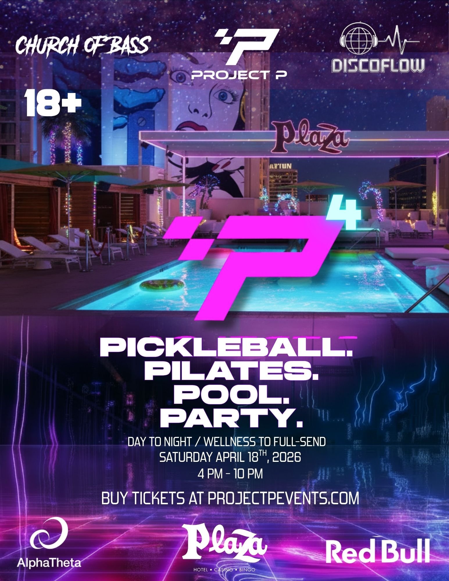 P4 starts with wellnes: pickleball, pilates, house music—then flips after dark into full-send mode with bass house, blacklights, and zero chill. The evening hits with glow pilates and glow pickleball, turning the courts and pool into a full-blown afters.